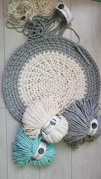 A zsinórfonalból készült szőnyegek, kosarak, lakásdekorációk könnyed, légies hatásúak. Imádom, hogy nem kell azon aggódnom horgolás közben, hogy egyenetlen lesz a fonal, vagy csomók lesznek benne. Horgolás közben szinte magától horgolódik, annyira jó vele dolgozni. A fonalszál szövése sűrű, egyenletes