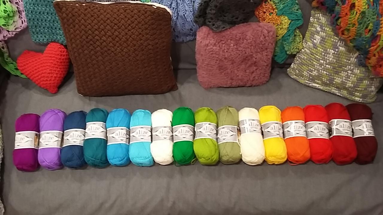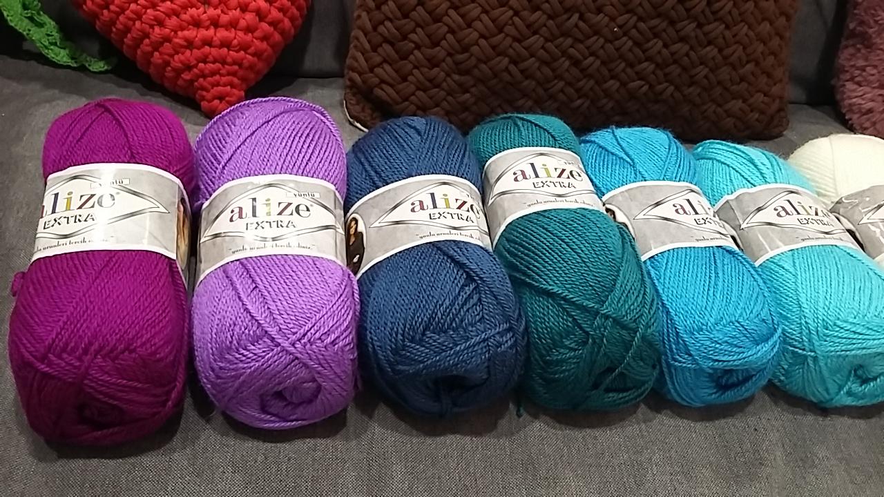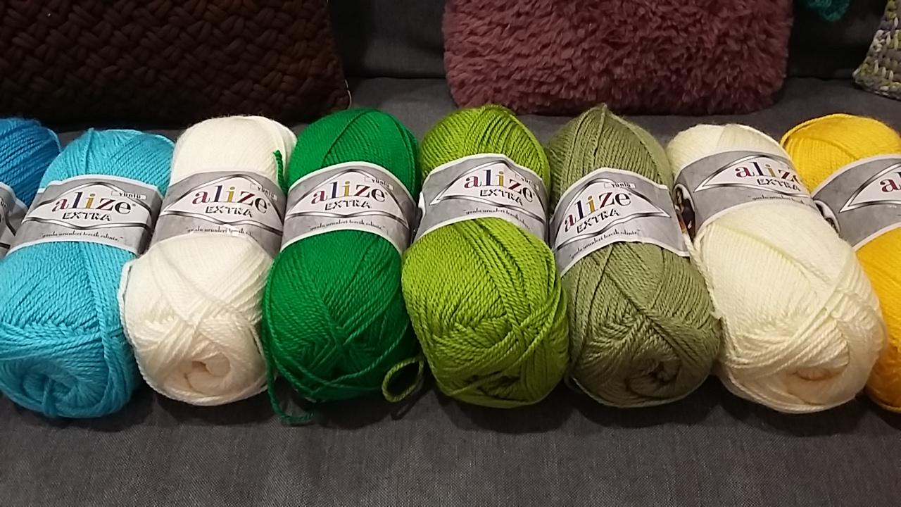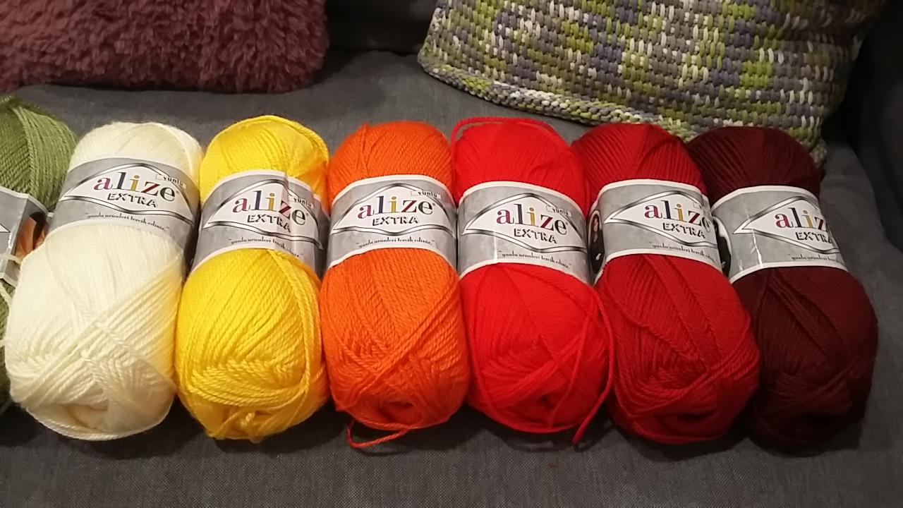 Az első választásunk az ALIZE EXTRA, ami egy sokoldalúan felhasználható, 10% gyapjút is tartalmazó fonal, amely nagy színválasztéka miatt kifejezetten alkalmas egy jó kis takaró elkészítésére. A fonal teljes színválasztéka elég széles, a miáltalunk összerakott színpaletta így néz ki: